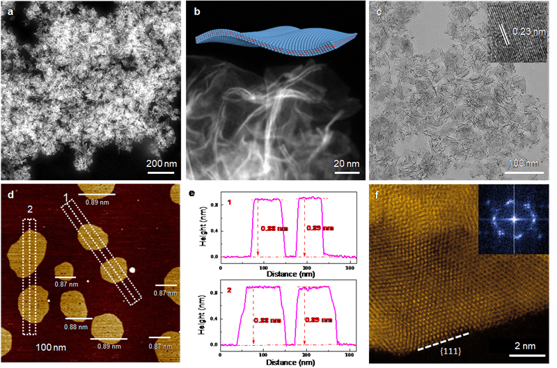 图1. 钯钼双金属烯的结构表征。(a-c)电子显微镜图片;(d, e)原子力显微镜图片及厚度分析;(f)球差透射电子显微镜图片