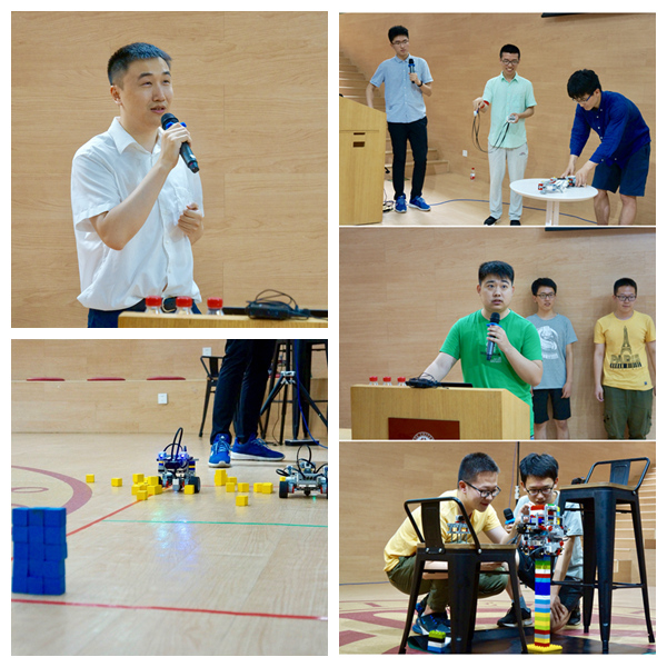 “乐高机器人”组竞演。左上:指导教师杨越研究员介绍相关情况;左下:机器人推塔对抗赛;右上至下:“乐高机器人”小组同学展示设计作品