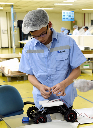 7月12日上午8时,学生们集体到达晶澳奉贤基地车间继续对电池板进行最后的调整,加固电池板与遥控越野车的连接,根据当天当地的太阳光方向调整电池板的倾斜角度。