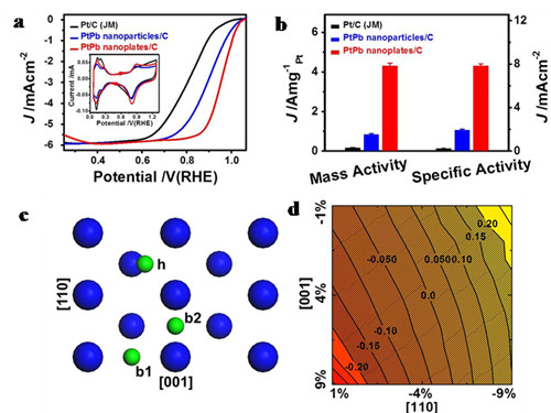 近日,北京大学郭少军">郭少军研究员和苏州大学、美国Brookhaven国家实验室相关研究人员的联合团队在燃料电池阴极高效氧还原催化剂的研究取得重大突破。该工作首先通过化学油相合成并精细表征了具有特殊结构的六方PtPb合金纳米片,并评价了该材料的氧还原和醇氧化催化性能,最后基于量化计算结果证明膨胀晶格应力对Pt(110)面的催化性能有大的促进作用。这一全新活性位点的提出突破了过去人们对晶格应力作用的传统理解,为高性能电催化材料的设计和开发指出了新方向。该合作成果发表在最新一期的国际权威学术期刊《科学》(Science)上(链接:http://science.sciencemag.org/content/354/6318/1410),并被同期Science杂志评为Highlight(http://science.sciencemag.org/content/354/6318/1378)。