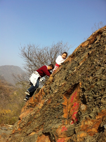 大概经过两个小时的路程,大家来到京西古道的入口。道路两边是彩色的树林,路面上一块块光滑得像大鹅暖石一样的石头镶嵌在彩色小草覆盖的泥土里,上面散落着曾经缤纷落下的黄叶子、红叶子。山路蜿蜒崎岖,年轻老师忙前跑后帮助照看小孩子和照顾年龄长的老师。